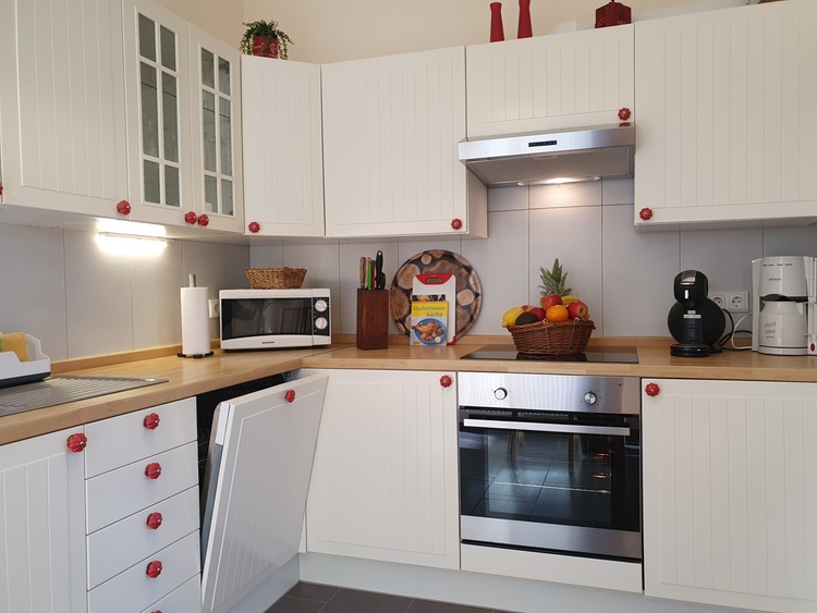Kühlschrank, Geschirrspüler, Geschirreinrichtung, Elektroherd, Tiefkühlfach, Mikrowelle, Wasserkocher, Kaffeemaschine, Toaster, Besteck, Gläser