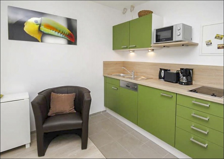 An den Wohn-Schlafbereich grenzt die komfortable Einbauküche, welche voll ausgestattet ist. Hier finden Sie einen 2-Platten-Herd, Kühlschrank mit ****-Gefrierfach, Mikrowelle mit Grillfunktion, Toaster, Kaffeemaschine und natürlich genügend Geschirr, Töpfe und Pfanne.