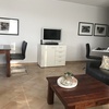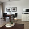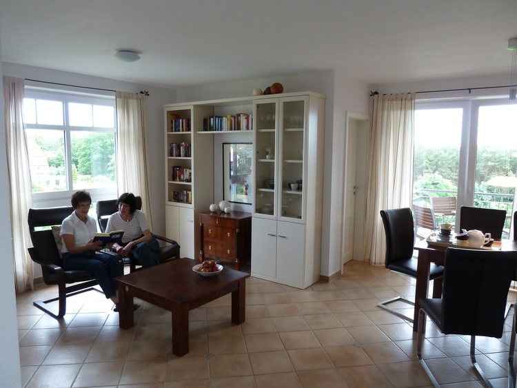 Das exklusive, helle Appartement im Obergeschoss verfügt über eine neue Einbauküche, Fußbodenheizung, stilvolle Möbel und einen schönen Ausblick ins Grüne. Der Wohnraum ist gemütlich mit einem Schlafsofa, bequemen Sesseln und einem einladenden Essplatz eingerichtet. Von hier aus erreichen Sie den überdachten Südbalkon.