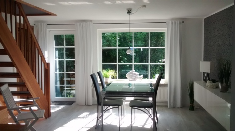 Im Erdgeschoss befindet sich die helle, große, Einbauküche mit integriertem Essraum. Von dort kommen Sie auf die ungestörte Terrasse, mit direktem Blick in den Wald.