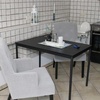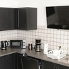 Kühlschrank, Geschirreinrichtung, Elektroherd, Tiefkühlfach, Mikrowelle, Wasserkocher, Kaffeemaschine, Toaster, Eierkocher, Besteck, Gläser