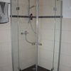 Geräumiges Bad mit bodengleicher Dusche 90/90 cm, Kosmetikspiegel und Föhn.