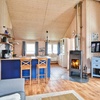 Der Haustyp A verfügt über zwei separate Schlafzimmer. Eines ist mit einem Boxspring-Doppelbett, das andere mit zwei Einzelbetten ausgestattet. Der großzügige Wohnraum geht in den offenen Küchen- und Essbereich über. Der Kaminofen bildet das Zentrum des Wohnraumes und lädt zu gemütlichen Abenden ein. Die Farbe blau bestimmt hier das maritime Erscheinungsbild.