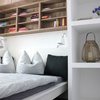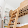 Schlafzimmer Kinder: Doppelstockbett (Liegefläche jeweils 90 x 200 cm; am oberen Bett ist der Rausfallschutz fest montiert, für das untere Bett ist ein modularer Rausfallschutz vorhanden und kann mit wenigen Handgriffen schnell selbst montiert werden), Allergiker geeignete Komfortschaummatratzen, Regal mit einigen Spielen und Büchern, Laminat-Boden