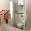 Bad: Waschtisch mit Waschbecken, großer Wandspiegel, Dusche, WC, Haartrockner, gefliester Boden und Wände, Warmwasserspeicher