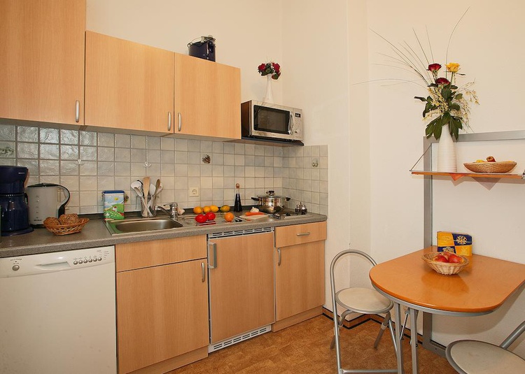 Kühlschrank, Geschirreinrichtung, Elektroherd, Wasserkocher, Kaffeemaschine, Besteck