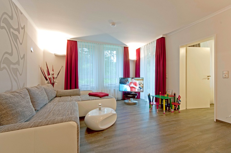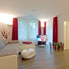 Die Ferienwohnung hat einen Wohnbereich mit Kinderspielecke und offener Küche,