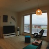 Bequeme Wohnelemente und ein Flach-TV laden zum Entspannen am (Gel-/Ethanol) Kaminofen ein. Von hier haben Sie einen grandiosen Blick auf den Hafen.