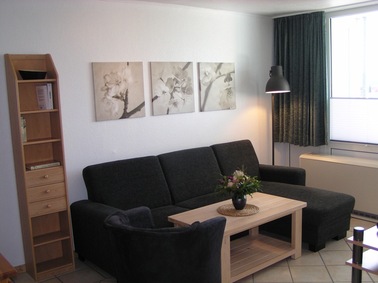 Durch den Flur erreichen Sie das modern eingerichtete Wohnzimmer, von dem die kleine Küche sowie die beiden Schlafzimmer abgehen.