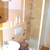 Das Badezimmer ist mit einer Dusche, ein Waschbecken und ein Wandhängendes-WC eingerichtet. Auch im Bad finden Sie die liebevolle Dekoration.