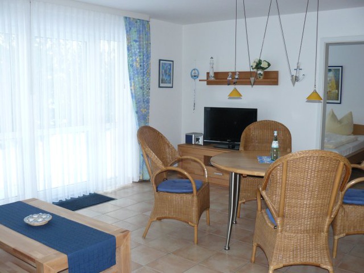 Zur Einrichtung der Wohnung gehören eine Komfortküche mit Spülmaschine, Mikrowelle und Grill, ein geschmackvoll eingerichteter Wohn-Ess-Bereich mit digitalem LCD-TV, DVD-Player und Stereoanlage mit CD-Player, kostenloser Internetzugang durch WLAN. Das gesonderte Schlafzimmer ist mit einem Doppelbett und reichlich Schrankraum ausgestattet. Im Wohnbereich findet sich ein Schlafsofa mit Longchair.