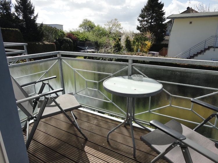 Balkon: 2 Stühle, Tisch, Auflagen, Sonnenschirm.