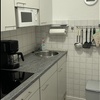 Kühlschrank, Geschirreinrichtung, Elektroherd, Tiefkühlfach, Mikrowelle, Wasserkocher, Kaffeemaschine, Toaster, Eierkocher, Besteck, Gläser