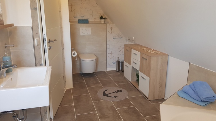Das mittlere Appartement verfügt über einen ganz besonderen Charme. Im Erdgeschoß befindet sich der Wohnflur, 1 Schlafzimmer mit 2 Einzelbetten und 1 Bad mit Wanne. Über das Schlafzimmer gelangt man zur gemütlichen Terrasse. Der Wohn-Essbereich mit offener Küche befindet sich im Obergeschoß. Im Dachgeschoss befindet sich das Schlafzimmer mit Doppelbett, separate Dusche und separates WC. Zum Süden befindet sich eine Dachterrasse, zum Norden ein Balkon, die beide blickdicht sind. Vom Balkon aus genießen Sie den reinen Fördeblick!