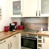 Die offen gestaltete Küche ist mit Geschirrspüler, Ceranfeld, Backofen, Kaffeemaschine, einer Nespresso Vertuo Next, einer Senseo, einem Milchaufschäumer, Toaster, Wasserkocher und einem Kühlschrank inkl. Gefrierfach ausgestattet. I.d.R. ist auch ein Grundstock an Gewürzen, Kaffee, Kaffeekapseln, Tee und Spülmaschinentabs vorhanden.