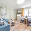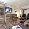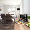 Im kombinierten Wohn- und Essbereich finden Sie eine gemütliche Sitzgelegenheit, Flachbildfernseher, Radio und eine integrierte Küchenzeile mit Kühlschrank, Kochfeld, Backofen, Wasserkocher, Toaster und Kaffeemaschine.