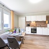 Über die kleine Zugangstreppe erreichen Sie die Wohnung 3. Diese Wohnung hat auf 69 Quadratmetern Platz für vier Personen. Das 1. Schlafzimmer grenzt an den Wohnbereich. Das 2. Schlafzimmer erreichen Sie über den Wohnungsflur. Die obere Wohnung 4 bietet ebenso bis zu vier Personen auf 74 Quadratmetern Platz.