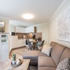 Im kombinierten Wohn- und Essbereich finden Sie eine gemütliche Sitzgelegenheit, Flachbildfernseher, Radio und eine integrierte Küchenzeile mit Kühlschrank, Kochfeld, Backofen, Wasserkocher, Toaster und Kaffeemaschine.