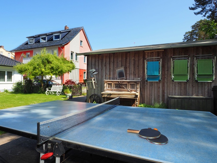 Jede Wohnung hat ihren eigenen Parkplatz hinter dem Haus. Der Garten lädt zum grillen, chillen und Tischtennis spielen ein.