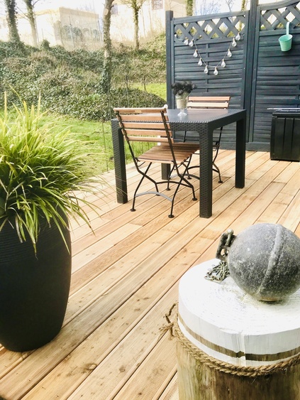Die Terrasse bietet eine schöne Sitzmöglichkeit und zwei Liegen zum Entspannen. Eine Markise spendet an heißen Tagen Schatten. Zusätzlich gibt es für ungestörte Momente eine Seitenmarkise. Die elektrischen Aussenjalousien bieten die Möglichkeit, die Wohnung komplett zu verdunkeln.