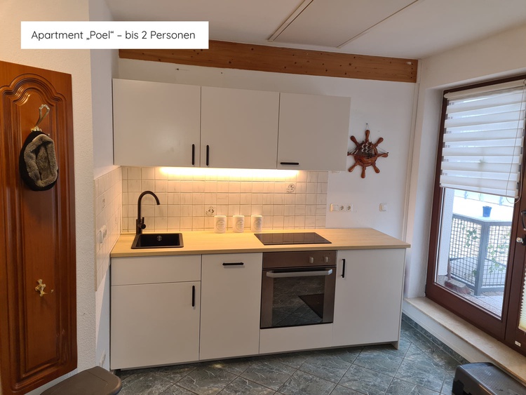 Das Ferienapartment „Poel“ hat ein Wohnzimmer mit Schlafbereich und Küchenzeile, sowie ein Badezimmer mit Dusche. Die neue Küchenzeile des Apartments ist mit einem Kühlschrank, Geschirrspüler und Induktionsherd ausgestattet. Die Wohnung verfügt weiterhin über einen Smart-TV mit Internetzugang, einen Grill und Heizung.