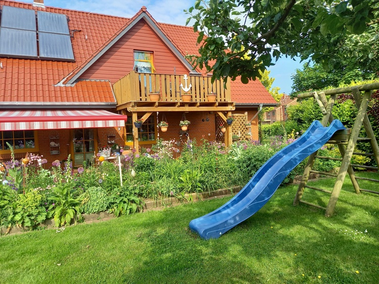Von der Küche geht es auf den Balkon,der ist mit Gartenmöbel ausgestattet.Vom Balkon ist der Spielplatz m.Schaukel einsehbar.
