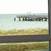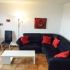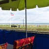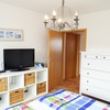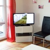 Vom Sofa der Fewo geht der Blick durch die Terrassentür auf die Schönberger Seebrücke, die sich nur wenige Meter entfernt befindet. Die Wohnung verfügt über einen zweiten Balkon, der aus einem der beiden Schlafzimmer zugänglich ist.