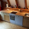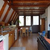 unten: grosser Wohnraum in Massivholz mit Küchenzeile (reichhaltige Küchenausstattung, Herd mit Backröhre, Spülmaschine etc.), Sitzecke, Essecke, Kamin, Sat-TV, Radio; Bad (Dusche/WC) mit Fussbodenheizung