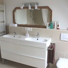 Das Bad verfügt über einen modernen Doppelwaschtisch, Badewanne und Dusche.