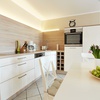 Kühlschrank, Geschirrspüler, Geschirreinrichtung, Elektroherd, Tiefkühlfach, Mikrowelle, Wasserkocher, Kaffeemaschine, Toaster, Besteck, Gläser